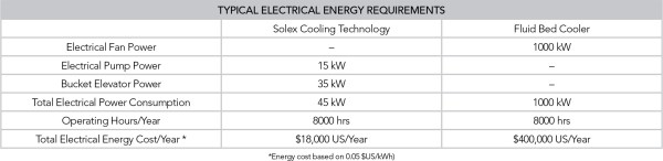 The challenge with using air to directly cool bulk solids is the large quantity of air required by fluid beds and the expense involved in processing and cleaning that air. Below is an energy comparison between a fluid bed and the plate-based heat exchangers used by Solex