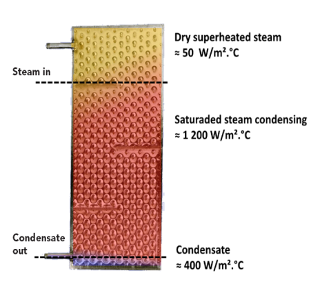 To start, a common misconception is that, because superheated steam has a higher temperature than saturated steam at the same pressure, it should increase the performance of the heat exchangers. In fact, superheated steam decreases the heat transfer by more than 95%, and thereby decreases the performance of the energy that is being exchanged, as shown on the illustration below.