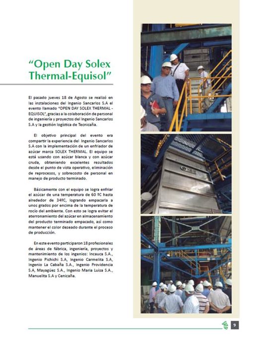An article posted to http://www.tecnicana.org/web_/index.php/revista (page 9) discusses how the lower product temperature achieved through the Solex technology helped to eliminate caking, reprocessing and its associated costs for both refined and raw sugar. It also lists all of the sugar mills that participated in the event.